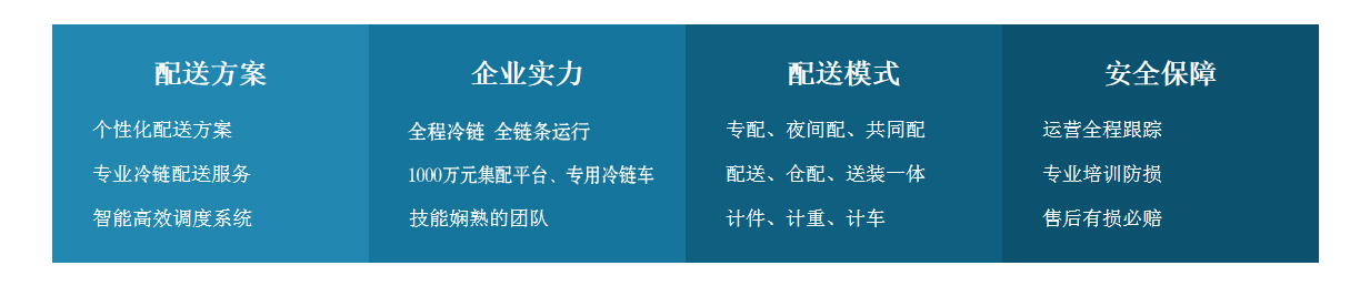 公司建設(shè)集配平臺和專用冷鏈車,發(fā)揮冷鏈物流特色,實(shí)現(xiàn)農(nóng)產(chǎn)品、醫(yī)藥、鮮花、食品、冷鮮產(chǎn)品的智能配送,并通過物聯(lián)網(wǎng)及云平臺系統(tǒng)實(shí)現(xiàn)全程追溯式管理,提供“最后一公里”解決方案。全程冷鏈,全鏈條運(yùn)行,為千家萬戶提供安全放心食品。