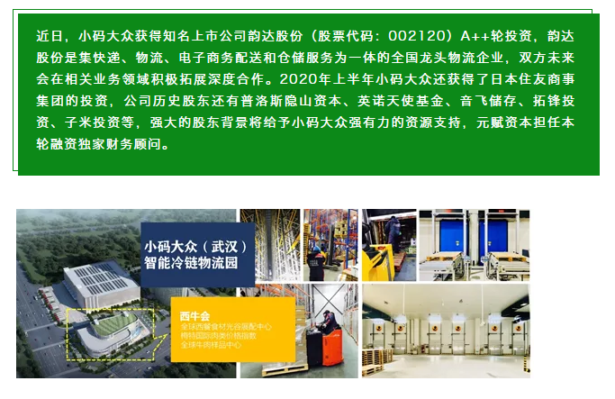 元賦資本主管合伙人湯元表示:食品冷鏈流通服務(wù)是基礎(chǔ)的民生行業(yè),后疫情時代冷鏈流通和食品安全尤其受到各界重視,政府及冷鏈行業(yè)各種支持政策措施和冷鏈標(biāo)準(zhǔn)頻出。同時國內(nèi)食品冷鏈第一輪洗牌也接近尾聲,新的食品冷鏈分銷服務(wù)體系正在構(gòu)建中,國內(nèi)食品深度分銷渠道至今缺少高效、標(biāo)準(zhǔn)且能大規(guī)模復(fù)制的冷鏈基礎(chǔ)設(shè)施,小碼大眾有望用更加輕資產(chǎn)、且盈利的模型服務(wù)好新的零售餐飲電商等經(jīng)濟業(yè)態(tài),構(gòu)建以冷鏈物流效率為基礎(chǔ)的S2b深度分銷供應(yīng)鏈服務(wù)平臺。