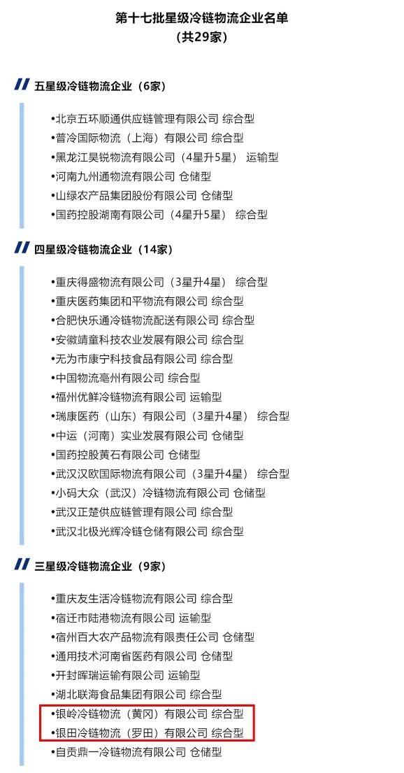 2月5日,中國物流與采購聯(lián)合會(huì)官網(wǎng)發(fā)布了第十七批星級(jí)冷鏈物流企業(yè)公示,銀嶺冷鏈物流(黃岡)有限公司、銀田冷鏈物流(羅田)有限公司通過了全國三星級(jí)冷鏈物流企業(yè)(綜合型)評(píng)審。 依據(jù)《物流企業(yè)冷鏈服務(wù)要求與能力評(píng)估指標(biāo)》(GB/T 31086-2014)國家標(biāo)準(zhǔn)和中國物流與采購聯(lián)合會(huì)冷鏈物流企業(yè)星級(jí)評(píng)估的相關(guān)制度辦法,按照企業(yè)自檢、申請(qǐng)、審核、現(xiàn)場評(píng)估、審定和公示等規(guī)范的評(píng)估程序,從企業(yè)的設(shè)施設(shè)備、信息化和管理與服務(wù)三個(gè)方面,按照公平、公開、公正的原則開展了第十七批星級(jí)冷鏈物流企業(yè)服務(wù)能力的評(píng)估。